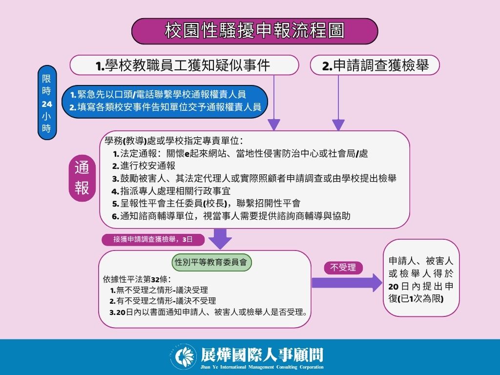 在校園內,如果學生遭受到校長、教師或同學的性騷擾,要向學校提出申訴,依《性別平等教育法》(性平法)進行調查。這邊提供申訴流程圖供大家參考: