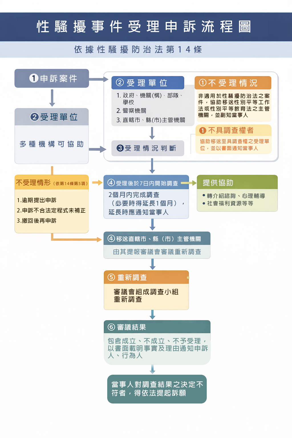 期限: 一般性騷擾需於事件發生後 2 年內提出;權勢性騷擾則為 3 年。